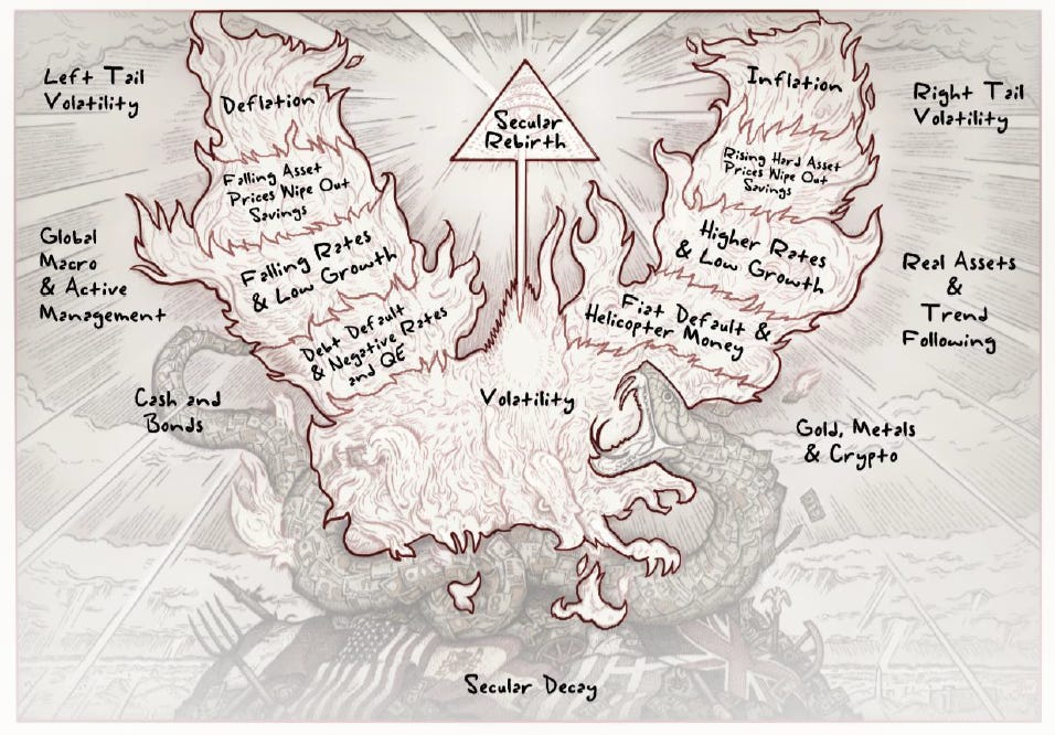 The Serpent: Represents periods of secular growth, stability, and globalization (bull markets). Most investors thrive here but are “blinded” by recent success.
